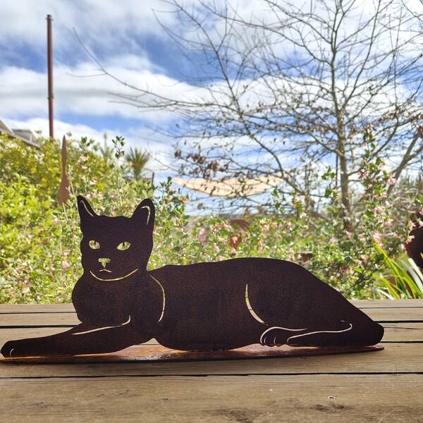 This Medium Reclining Cat Stand is a fun addtion to your garden or house. It is 510mm wide,210mm tall and 65mm deep.This stand is finished with a rust patina.