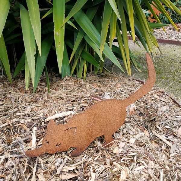 STK025 This artwork is made from mild steel which has developed a unique rust patina. This cat stake is 400mm wide, sits 300mm above ground level with a stake that goes down approximately 150mm into the ground.