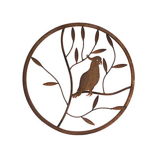 WPA112 This Cockatoo Round Wall Art is made from mild steel which has developed a unique rust patina. This rusted surface can then be sealed to preserve the metal. This cockatoo artwork is 680mm Diameter.