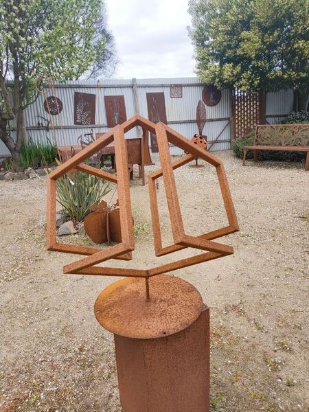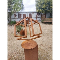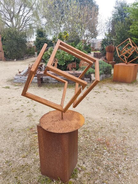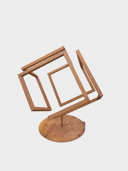 This striking metal sculpture features a series of interlocking geometric frames that seem to defy gravity. Crafted from weathered steel with a rich rust patina, it combines industrial strength with minimalist elegance. The angled design creates a dynamic sense of motion, as if the cubes are frozen mid-spin. Perfect as a garden centrepiece or modern indoor accent, this artwork celebrates balance, perspective, and the beauty of raw materials.