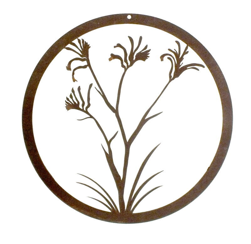 WPA166 This Kangaroo Paw Wall Art is made from mild steel which has developed a unique rust patina. This rusted surface can then be sealed to preserve the metal. This Wall art is 300mm in Diameter.