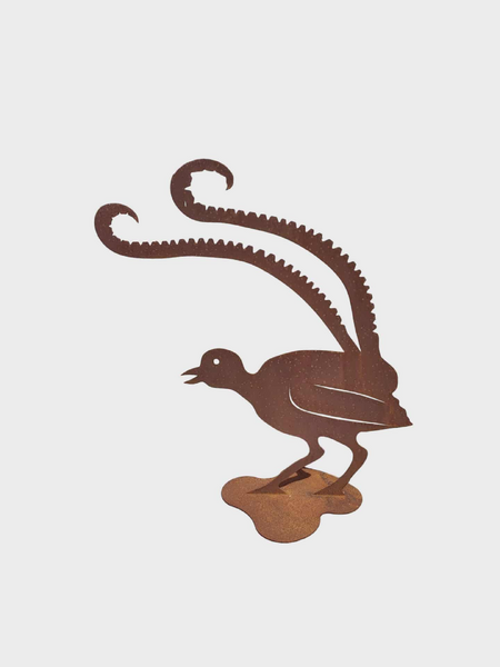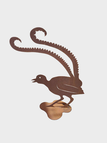 This Lyre Bird Stand is made from mild steel, which has developed a unique rust patina, enhancing its rustic charm. This impressive piece captures the beauty of the lyre bird in its intricate design. Mounted on a sturdy base plate, it is perfect for showcasing in larger outdoor spaces or as a striking indoor feature. The natural patina finish gives it a timeless, earthy look that blends seamlessly with nature, adding an artistic touch to any garden or home setting.