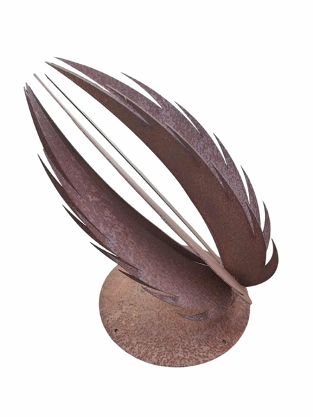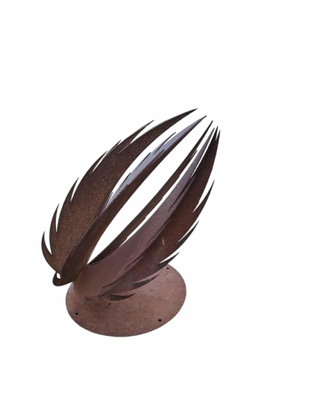 This garden sculpture is a bold and elegant statement piece, crafted from rusted steel with a striking organic form. Shaped like an egg its curvacious flamed edges resemble  a plant or organic seed.Perfect as a focal point in a garden or landscape, this sculpture brings a sense of movement, harmony, and sophistication to any outdoor space.It would also look great elevated on a plinth.