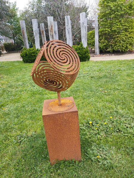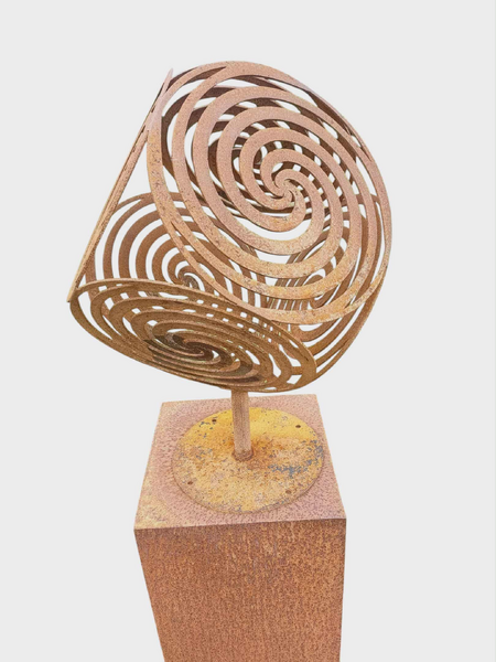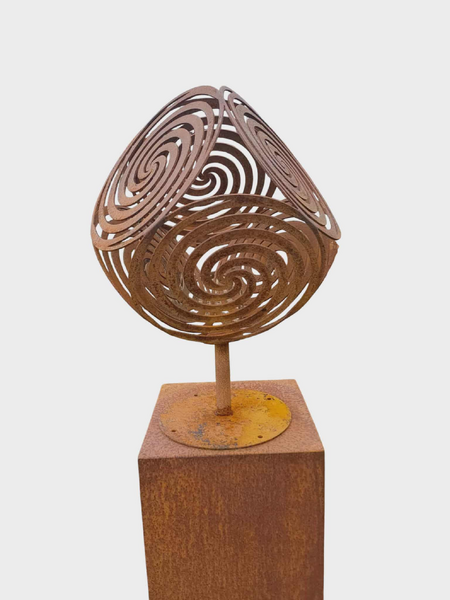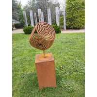 This sculpture is made from mild steel which has developed a unique rust patina. The lovely swirl pattern in the metal adds a fun and contemporary feel to your courtyard or garden.