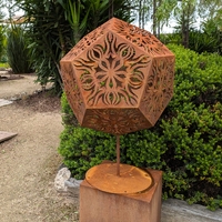 Crafted from mild steel, this striking Flame Geosphere features intricate laser-cut patterns across every face, creating a stunning interplay of light and shadow. Over time, the steel has developed a rich rust patina, giving the piece a warm, earthy character that blends beautifully into any garden setting. Elevated on a simple stand and set atop a sturdy base, this contemporary design adds a bold architectural statement to your outdoor space—perfect as a focal point among greenery or along a garden path.