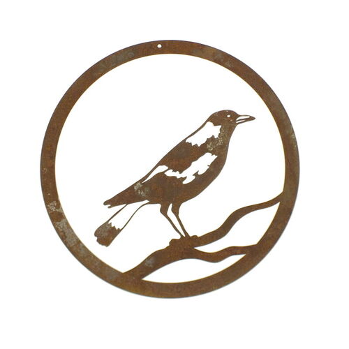 WPA147 This Magpie Wall Art is made from mild steel which has developed a unique rust patina. This rusted surface can then be sealed to preserve the metal. This Wall art is 300mm Diameter.